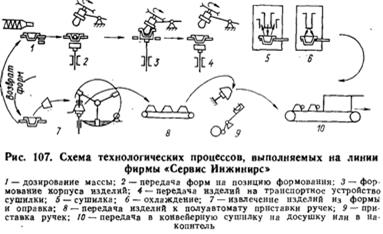 Автоматизированная линия фирмы «Нейтчш» (ФРГ) предназначена для изготовления чашек и блюдец четырех типоразмеров. Производительность линии достигает 20 млн. изделий в год. Конструктивно линия представляет собой комплекс узлов формования, сушки, оправки и приставки ручек (рис. 108). Узел формования имеет четыре подъемных шпинделя и четыре формующие головки, закрепленные на трубчатой раме, расположенной над конвейером сушилки для предварительной сушки изделий. Во время формования для удержания гипсовых форм в шпиндельных головках поддерживается вакуум 0, 06—0, 08 МПа. Подсушенные изделия извлекаются из гипсовых форм подъемником переставителя с резиновыми призмами для чашек и колпачками для блюдец. Кантователь, захватив изделия, поворачивается и устанавливает их на подставки полок горизонтального конвейера, подающего чашки под механизм зачистки краев. Зачистка краев блюдец на линии не производится.