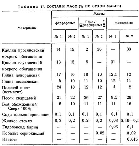 Санитарно-строительные изделия (унитазы, биде, умывальные столы и т. д.) изготовляют нз фарфоровых, полуфарфоровых и фаянсовых масс методом литья в гипсовых формах с последующими сушкой " н обжигом. Изделия относят к типу тонкокерамических, имеющих плотный (фарфоровые и полуфарфоровые изделия) или пористый (фаянсовые) черепок, покрыты прозрачной или глухой глазурью, белой или цветной. Физико-механические свойства изделий приведены в табл. 16.