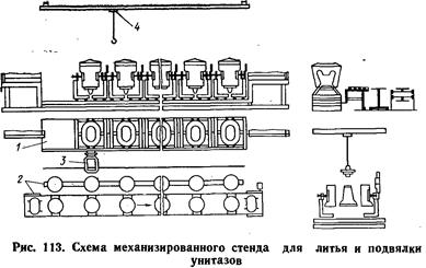 Длительность подвяливания фарфоровых унитазов на рольганговом конвейере 3, 5—4 ч при температуре теплоносителя 38—42° С, умывальных столов на монорельсе при температуре 25±3°С — 24 ч. Обычные стендовые способы отливки изделий требуют больших производственных площадей, так как съем изделий с 1 м2 площади стенда почти в 2 раза ниже, чем при отливке изделий на конвейере, связаны с тяжелым физическим трудом, не позволяют автоматизировать процессы отливки изделий. С целью повышения эффективности стендовой отливки в НИИстройкерамики разработаны механизированные стенды, в которых сочетаются достоинства стендовой отливки (организация труда) с конвейерной (высокий уровень механизации и автоматизации).