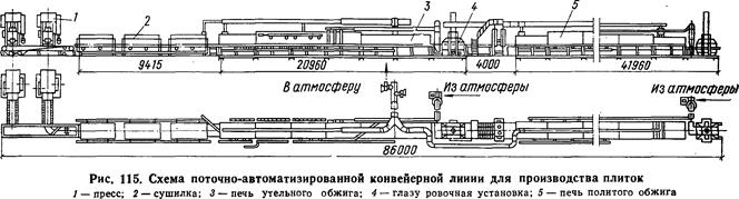 Облицовочные плитки представляют собой изделия, изготовленные из фаянсовых масс, обожженные и покрытые с лицевой стороны прозрачной или глухой глазурью. По форме плитки бывают квадратные, прямоугольные и фасонные (рис. 114). В соответствии с ГОСТ 6141—82 выпускают 28 типов плиток, не считая встроенных и навесных деталей. Предел прочности плитки при изломе 14—30 МПа, при сжатии 98—128 МПа. Лицевая поверхность плиток должна быть гладкой, плоской и равномерно покрытой глазурью — блестяшей или матовой, глухой или прозрачной, одного цвета или многоцветной. Кроме плиток с гладкой поверхностью бывают плитки с рельефной, офактуренной и пирамидальной поверхностью. Сырьем для фаянсовых облицовочных плиток являются светложгущиеся огнеупорные глины и каолины — веселовская (марки ДВ-1 и ДВ-0), латненская (марки ЛТ-2), черкасский бентонит, глуховецкий каолин мокрого обогащения или просяновский каолин сухого обогащения, а также положский, новоселицкий, владимиров-ский и другие каолины. В качестве отощающих компонентов в массу вводят кварцевый песок, политой и утельный бой изделий, обожженный каолин, бой огнеупорного припаса, пирофиллит и др. Масса плиток содержит около 50% глинистых материалов (каолин, глина, бентонит), 10—25% кварцевого песка и до 35% боя изделий. При скоростном обжиге плиток ввод в массу обычных плавней — полевого шпата, пегматита, талька— неэффективен из-за малого времени протекания процессов при пониженных температурах обжига. Поэтому в качестве плавней вводят нефелин-сиенит, перлит, шлаки, мел, бой стекла, «эрклез» и др. Комплексный ввод плавней, содержащих щелочи (перлит, нефелин-сиенит) и щелочноземельные оксиды (мел, тальк, магнезит, металлургические шлаки и др.), позволяет снизить общее содержание плавней в массе на 10—15% при пониженных температурах обжига. Введение бентонита позволяет уменьшить количество глинистых компонентов на 3—15% или полностью заменить их.