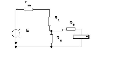 Для измерения ЭДС Е с rвн=R используется вольтметр класса gВ с верхним пределом U в(max) и внутренним сопротивлением R В или током потребления Iпр. 1.Определить относительную методическую погрешность измерения ЭДС при R Н® ¥. 2. Вывести формулы определения методической погрешности, предел допускаемой относительной погрешности прибора и сравнить ее с методической погрешностью, если ЭДС равна E вольт при а) R H®¥ и б) R H =R H 3. Определить мощность, потребляемую нагрузкой Рн и измерительным прибором Pпр=Uпр Iпр и КПД процесса измерения. 4. Определить RВ(min), чтобы методическая погрешность измерения U не превышала -0.01%; -0.1%; -1%; -10%.