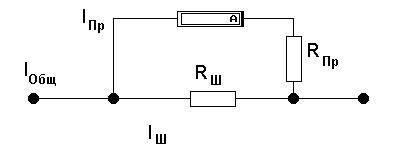 Если измеряемый токI превосходит по значению ток полного отклонения подвижной части прибора Iпр, то параллельно измерительному прибору (ИП) подключают шунт, через который пропускают ток шунта Значение сопротивления шунта Rш определяется из условия равенства падений напряжений на шунте и ИП, так как они включены параллельно.