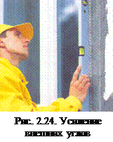 Для этого необходимо зубчатой стороной кельмы нанести клеевой состав слоем толщиной не более 2 мм. Затем вдавить " заплатку" из сетки к поверхности стены. Проступивший через ячейки клеевой состав снимается гладкой стороной кельмы. Общий вид здания, после окончания работ по усилению углов оконных и дверных проемов показан на рисунке (рис. 2.25). Для армирование оконных и дверных откосов зубчатой стороной кельмы нанесится на обе плоскости усиливаемого угла клеевой состав толщиной слоя не более 2 мм. Затем пластиковый уголок необходимо вдавить так, чтобы его полки были плотно прижаты к плоскостям усиливаемого угла.