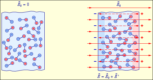 Вещество, внесенное в электрическое поле, может существенно изменить его. Это связано с тем, что вещество состоит из заряженных частиц. В отсутствие внешнего поля частицы распределяются внутри вещества так, что создаваемое ими электрическое поле в среднем по объемам, включающим большое число атомов или молекул, равно нулю. При наличии внешнего поля происходит перераспределение заряженных частиц, и в веществе возникает собственное электрическое поле. Полное электрическое поле