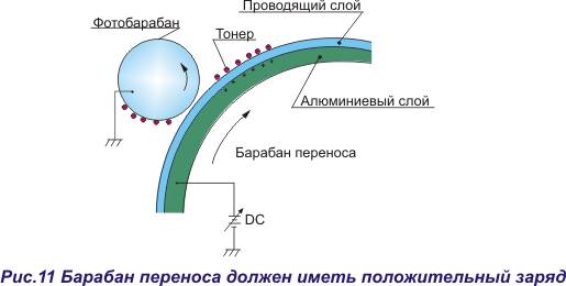 Поэтому следующим этапом в создании изображения является передача проявленного изображения на барабан переноса. Этот этап называют этапом первичного переноса. Перенос тонера с одного барабана на другой происходит за счет электростатической разности потенциалов, т.е. отрицательно заряженные частички тонера должны притянуться положительным потенциалом на поверхности барабана переноса. Для этого на поверхность барабана переноса подается положительное напряжение смещения постоянного тока от специального источника питания, в результате чего вся поверхность этого барабана имеет положительный потенциал. При полноцветной печати напряжение смещения на барабане переноса должно постоянно увеличиваться, т.к. после каждого прохода количество отрицательно заряженного тонера на барабане возрастает. И для того, чтобы тонер мог переноситься и ложиться поверх уже существующего тонера, напряжение переноса увеличивается с каждым новым цветом. Этот этап формирования изображения показан на рис.11.