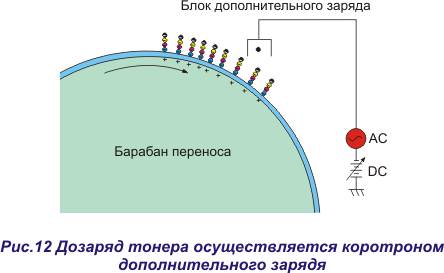 В процессе переноса тонера на барабан переноса отдельные частички тонера могут остаться на поверхности фотобарабана, и они должны быть удалены, чтобы не искажать последующее изображение. Для удаления остатков тонера в принтере имеется блок очистки фотобарабана (см. рис 17). В составе этого модуля имеется специальный вал – кисть для снятия заряда с тонера и фотобарабана – это ослабляет силу притяжения тонера к фотобарабану. Также имеется традиционный очистительный ракель, который соскребает тонер в специальный бункер, где он и хранится до тех пор, пока очистительный модуль не будет заменен или не будет вычищен. Далее фотобарабан снова заряжается (после предварительного разряда), и процесс повторяется до тех пор, пока на барабане переноса не будет полностью сформировано изображение соответствующего цвета. Поэтому размер барабана переноса должен полностью соответствовать формату печати, т.е. в данной модели принтера длина окружности этого барабана соответствует длине листа формата А3 (420 мм). После нанесения тонера одного цвета процесс формирования изображения полностью повторяется с той лишь разницей, что используется проявительный блок другого цвета. Для использования другого проявительного узла карусельный механизм поворачивается на заданный угол и подводит “новый” проявительный вал к поверхности фотобарабана. Таким образом, при формировании полноцветного изображения, состоящего из четырех цветовых составляющих, барабан переноса проворачивается четыре раза, и на каждом обороте к уже существующему тонеру добавляется тонер другого цвета. При этом первым наносится порошок желтого цвета, потом пурпурного, потом голубого и уже последним наносится черный порошок. В итоге, на барабане переноса создается полноцветное видимое изображение, состоящее из частичек четырех разноцветных тонер-порошков. После того, как тонер-порошок оказывается на поверхности барабана переноса, он проходит через блок дополнительного заряда. Этот блок (рис.12) представляет собой проволочный коротон, на который подается переменное напряжение синусоидальной формы (АС) с отрицательной постоянной составляющей (DC). Этим напряжением тонер порошок дополнительно заряжается, т.е. его отрицательный потенциал становится выше, что будет способствовать более эффективному переносу тонера на бумагу. Кроме того, дополнительное напряжение уменьшает значение положительного потенциала барабана переноса, что способствует правильному расположению тонера на барабане переноса и препятствует смещению тонера. Как результат этого – точное воспроизведение цветовых оттенков. Напряжение дополнительного заряда подается на барабан переноса во время нанесения желтого тонера, т.е. в самом начале процесса формирования изображения. При нанесении желтого тонер-порошка напряжение дополнительного заряда устанавливается на минимальное значение, и после нанесения каждого нового цвета это напряжение увеличивается. Максимальное напряжение дополнительного заряда подается во время нанесения черного тонера.