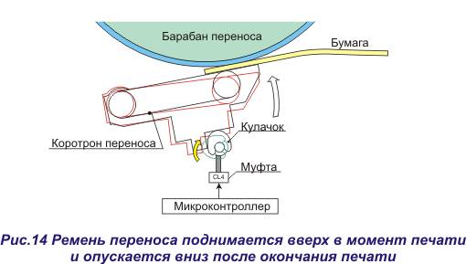 Таким образом, транспортный ремень во время создания изображения опущен вниз, и не соприкасается с барабаном переноса, а в момент вторичного переноса поднят вверх и касается этого барабана. Перемещение транспортного ремня коротрона осуществляется эксцентриковым кулачком, который приводится в действие электрической муфтой по команде от микроконтроллера (рис.14).