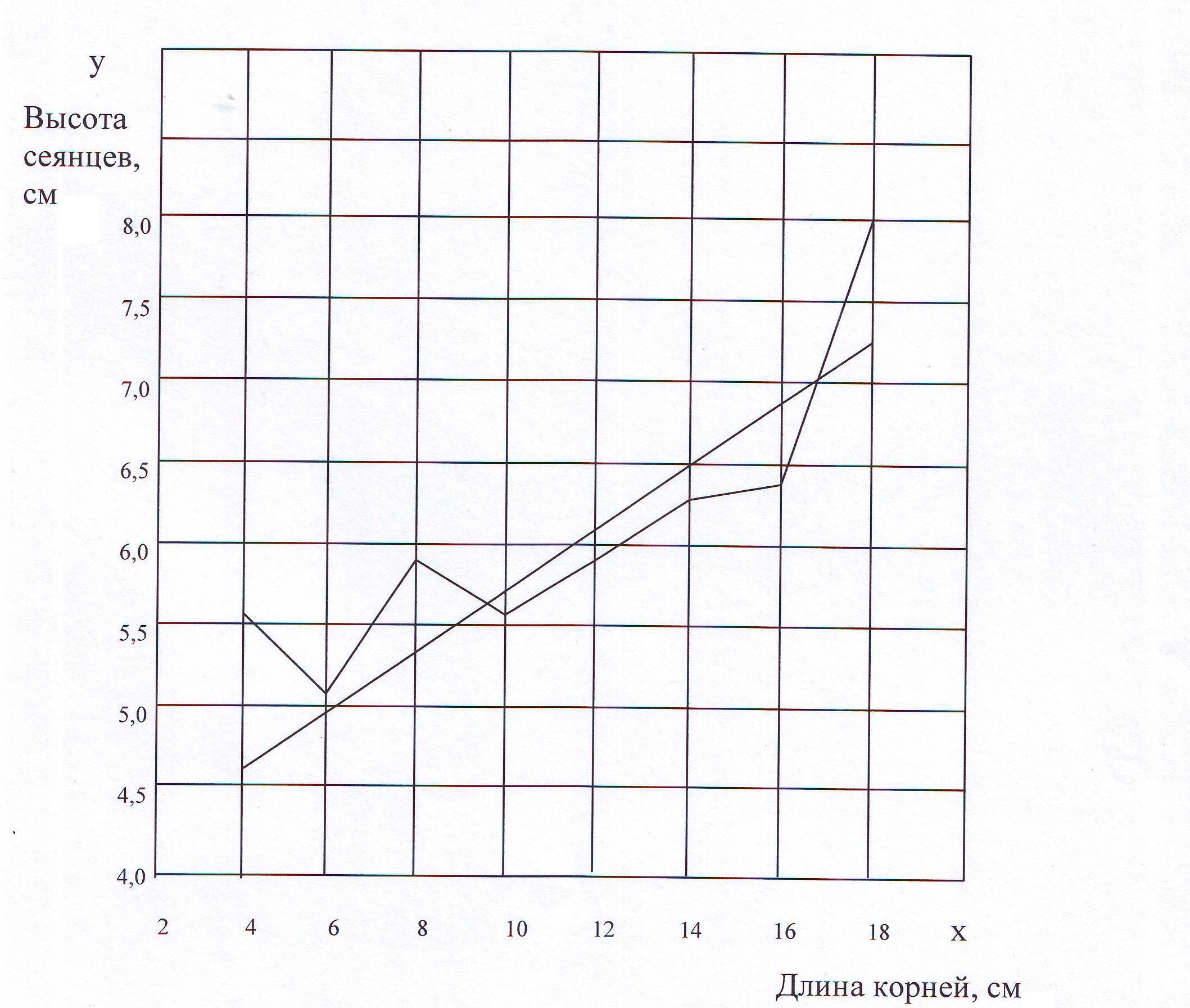 Рис. 13. Эмпирическая и теоретическая линии связи высоты однолетних сеянцев сосны (у) и длины их корневых систем (х). В нашем примере показатель криволинейности равен 0, 3402 –0, 2762 = 0, 040, следовательно, связь не является криволинейной. б) N (η 2 у/x – r 2) ≥ 11, 37, (49) где 11, 37 – критерий криволинейности Блэкмана. В нашем примере 100 · (0, 3402 – 0, 2762) = 100 · 0, 040 = 4 < 11, 37. С помощью критерия Блэкмана подтверждена прямолинейность связи высоты надземной части однолетних сеянцев сосны с длиной их корневых систем (рис. 13). В заключение отметим некоторые особенности, имеющие важное значение для анализа корреляционной связи, результаты которого получены в нашем примере: Коэффициент корреляции, рассчитанный двумя способами, имеет одно и то же значение (r = 0, 276). Предпочтение следует отдать второму способу совместного вычисления коэффициента корреляции и корреляционного отношения, так как этот способ позволяет: 1) определить ординаты связи и построить эмпирический график регрессионной связи; 2) определить степень кривизны связи; 3) рассчитать коэффициент детерминации и корреляционное отношение; 4) оценить уровень статистической достоверности коэффициента детерминации (r2) прямолинейной связи. Не подтвердилось высказанное первоначальное мнение о наличии криволинейной зависимости высоты однолетних сеянцев сосны от длины их корневой системы.