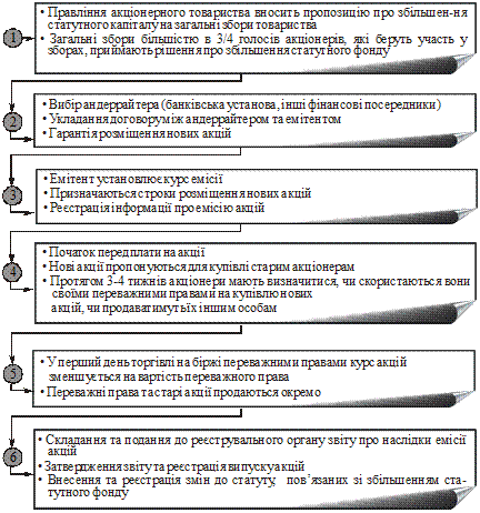 Фактична біржова ціна переважних прав визначається попитом та пропозицією на них, а отже, може відрізнятися від розрахункової. Головним фактором, який визначає попит на переважні права, є прогноз про майбутній ринковий курс акцій та розмір очікуваних дивідендів. Розглянуті цілі, порядок та загальні передумови збільшення статутного капіталу підприємств слід обов’язково враховувати, приймаючи рішення про використання цього інструмента залучення фінансових ресурсів. Зупинимося тепер на методах збільшення статутного капіталу.