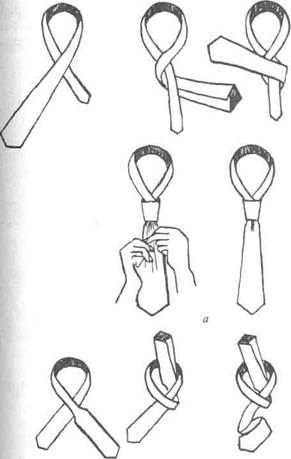 Считается, что галстук в нынешнем виде появился в Англии во второй половине XIX в., когда стали носить сорочки с отложным воротником. С тех пор мода на галстуки менялась, но, по сути, они остались теми же, только менялись их длина и ширина, материал и способы завязывания узла — простой, двойной и др. (рис. 1). При выборе галстука особое внимание нужно уделить его качеству. Следует избегать слишком ярких галстуков с броским узором, рисунками или незнакомыми гербами и символами. Нейтральными считаются галстуки в полоску или с мелким рисунком. По цветовой гамме галстук должен соответствовать костюму в целом, в том числе сорочке, носкам и туфлям. Его ширина зависит от ширины лацканов пиджака: чем шире лацканы, тем шире может быть галстук. В официальной одежде практически повсеместно принят галстук темных тонов в сочетании со светлой сорочкой. Черный галстук к белой рубашке обязателен при выражении скорби и соболезнования. По длине в большинстве случаев стандартный галстук завязывают так, чтобы он слегка перекрывал пряжку брючного ремня. При этом широкий конец галстука закрывает узкий. Галстук завязывают аккуратно, располагая узел строго по центру воротника сорочки. Съехавший набок галстук и распущенный узел говорят о разболтанности его хозяина. С галстуком можно носить специальный зажим или булавку-заколку, которая фиксирует его концы. Аксессуары играют большую роль в одежде мужчины. Требования к аксессуарам для мужчин мало изменились со временем. Их количество не велико: часы, зажим или заколка для галстука, запонки, ремень, бумажник, блокнот и ручка, причем желательно выполненные в едином стиле. Все эти детали туалета должны быть высокого качества. Стоит избегать дешевых изделий из анодированного алюминия или пластика. В карманах у мужчин не должно быть ничего лишнего; карманы не должны оттопыриваться. В брючных карманах могут быть носовой платок, ключи, зажигалка; карманные часы носят в специальном кармашке брюк; если его нет, для этого используют правый карман брюк. Личные документы, бумажник, очки, ручку, блокнот, расческу, сигареты, мобильный телефон следует хранить во внутренних карманах пиджака.