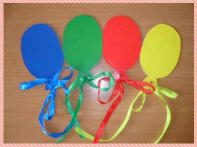Ход игры: Воспитатель показывает детям четыре воздушных шарика основных цветов и четыре ленточки таких же цветов к ним. Детям предлагают попробовать к каждому шарику подобрать ленточку того же цвета.