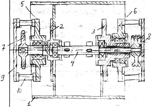 1. Бандаж сварной конструкции. 2, 3. Цапфы. 4. Вибровозбудитель круговых колебаний. 5, 6. Опорные устройства. 7. Звездочка. 8. Шкив клиноременной передачи. 9. Полурама. 10. Амортизаторы.
