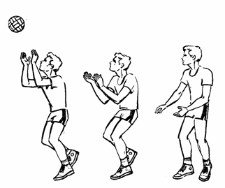 Рис.5. Передачи. В игре применяются передачи мяча сверху двумя руками, находясь в опорном положений, в прыжке и с падениями. Передача сверху двумя руками. В исходном положений туловище игрока расположено вертикально, ноги на ширине плеч или одна нога несколько впереди. Степень сгибания ног зависит от высоты траектории полета мяча. Руки выносятся перед лицом, кисти рук оптимально напряжены. С приближением мяча игрок начинает встречное движение выпрямлением ног, туловища и рук. При выполнении ударного движения в момент соприкосновения с мячом пальцы рук сначала амортизируют встречный полет мяча, затем кисти и пальцы рук упруго и эластично выпрямляются, придавая мячу новое поступательное движение. Указательные и средние пальцы являются основной ударной частью, безымянные и мизинцы удерживают мяч в боковом направлении. Сообщение мячу нового направления с определенной траекторией требует увеличения мышечных усилий, что проявляется в согласованном движении ног, туловища и рук (рис. 6). При передаче назад игрок поднимает руки, располагая их тыльной стороной кистей над головой, разгибает ноги, отклоняет туловище вверх-назад. Передача выполняется за счет разгибания рук в локтевых суставах и движения туловища назад-вверх, с одновременным прогибанием в грудной и поясничной частях позвоночного столба.
