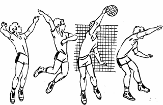 Рис. 7 Нападающие удары. В игре в волейбол используются прямой, боковой нападающие удары и удары с поворотом кисти и туловища. Прямой нападающий удар характеризуется сочетанием сложных по координации движений (рис. 7). Подготовка к выполнению прямого нападающего удара осуществляется за счет ускоренной ходьбы, переходящей в бег. Ритм разбега существенно зависит от скорости и траектории передачи мяча для выполнения нападающего удара. Длина разбега составляет 2‑ 3 шага и скачок. В скачке стопа вынесенной вперед ноги ставится на пятку (стопорящий шаг), вторая нога приставляется к первой, выпрямленные руки отводятся назад. Отталкивание от опоры начинают с махового движения руками по дуге сзади‑ вперед‑ вверх еще до активного разгибания ног. В волейболе прыжок вверх, как правило, максимально высокий, поэтому игрок должен оттолкнуться как можно сильнее. Одновременно со взлетом игрок выполняет замах бьющей рукой вверх‑ назад, прогибается в груди и пояснице, ноги слегка сгибает в коленных суставах, правое плечо (если правая рука ударная) отводит назад, левую руку, незначительно сгибая в локтевом суставе, отводит вверх‑ в сторону. В момент удара по мячу бьющая рука выпрямляется в локтевом суставе, растянутые при замахе мышцы живота, груди и руки резко сокращаются. Рука выпрямляется, кисть накладывается на мяч в расслабленном состоянии, удар выполняется в определенном направлений. После удара по мячу игрок приземляется на согнутые в коленных суставах ноги и на переднюю часть стоп.