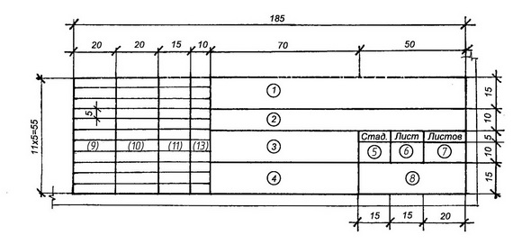 Рис. 1. Основная надпись на листах чертежей зданий. В графах основных надписей (номера граф на формах показаны в кружках) указывают: