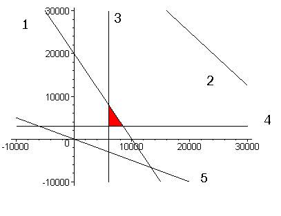 Составить математическую модель задачи и решить ее с помощью одного из методов: графическим способом, симплекс-методом (с введением искусственного базиса или без него), системы MAPLE (более высокую оценку получает решение полученное двумя способами). Задача: Звероферма выращивает черно-бурых лисиц и песцов. На Пусть х1 – количество песцов, х2 – количество лис. Тогда х1 – количество клеток с песцами, х2/2 - количество клеток с лисами, 5*х1 – количество корма для песцов, 4*х2 - количество корма для лис. Составим задачу: F=5*x1+10*x2 → max, при ограничениях x1+x2/2 ≤ 10000, (1) 5*x1+4*x2 ≤ 200000, (2) x1 ≥ 6000, (3) x2 ≥ 3000, (4) x1, x2 ≥ 0. > with(plots); > inequal({x1+x2/2< =10000, 5*x1+4*x2< =200000, x1> =6000, x2> =3000, 5*x1+10*x2=0}, x1=-10000..30000, x2=-10000..30000, optionsfeasible=(color=red), optionsexcluded=(color=white)); Для решения задачи воспользуемся графическим способом в системе MAPLE (обозначения: 1 – линия x1+x2/2 = 10000, 2 – линия 5*x1+4*x2 = 200000, 3 – линия x1 = 6000, 4 – линия x2 = 3000, 5 – линия grad(F)). Каждое неравенство задает полуплоскость. Их пересечение задает множество дополнительных решений. Чтобы найти максимальной значение целевой функции F=5*x1+10*x2 построим линию уровня 5*x1+10*x2=const(0) и будем двигать ее в направлении градиента. Последняя точка множества дополнительных решений даст максимальное значение целевой функции. Получим точку С = (1)∩ (3). Решим систему уравнений: x1+x2/2=10000, x2/2=10000-6000, x2=8000, x1=6000 x1=6000 x1=6000 Проверим правильность решения в системе MAPLE: > with(simplex); > maximize(5*x1+10*x2, {x1+x2/2< =10000, 5*x1+4*x2< =200000, x1> =6000, x2> =3000}, NONNEGATIVE);