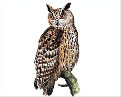 Пугач Bubo bubo (Linnaeus, 1758) Таксономічна належність Клас — Птахи (Aves), ряд — Совоподібні (Strigiformes), родина — Совові (Strigidae). Один з 13-ти видів роду, єдиний вид роду у фауні України. Природоохоронний статус виду Рідкісний. Ареал виду та його поширення в Україні Охоплює майже всю Євразію та Пн. Африку. На території України номінативний підвид B. b. bubo заселяє пн. і зх. р-ни, а пд.-руський B. b. interpositus — сх. (переважно Луганську обл.). Чисельність і причини її зміни В Україні налічують близько 200 пар, з них не менше 110 пар на сх. Європейська популяція виду складає не більше 38 тис. пар. Приблизно на половині постійних гніздових ділянок розмноження не спостерігається, можливо, через те, що один з птахів пари гине. На чисельність негативно впливають переслідування людиною, розлякування самок на ранніх стадіях насиджування (кидають кладку), загибель на ЛЕП. Особливості біології та наукове значення Осілий. Активний у сутінках і вночі. Токування відбувається наприкінці зими. Гніздиться по глухих ярах, берегових урвищах, скельних виходах, рідше в лісах і на болотах. Яйця відкладає в кінці лютого — на початку березня. Гнізда влаштовує на глухих ділян- ках лісів, байраків чи скельних виходів на землі в нішах, на виступах або під коріннями дерев і чагарників. У кладці 2–5 (частіше 3) яйця. Насиджує самка 33–35 діб. Пташенята виходять з гнізд вже у травні, літати починають лише у другій половині червня. Спектр живлення дуже різноманітний, переважають птахи, дрібні гризуни та їжаки.