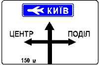 Знаки 5.17.1 и 5.17.2 с соответствующим количеством стрелок используются на дорогах, которые имеют три полосы и большее, если в каждом направлении насчитывается неодинаковое количество полос движения. С помощью знаков 5.17.1 и 5.17.2 со сменным изображением организовывается реверсивное движение. Знаки 5.16 и 5.18, которые разрешают поворот в левую сторону из крайней левой полосы, разрешают и разворот с этой полосы. Действие знаков 5.16 и 5.18, установленных перед перекрестком, распространяется на все перекрестки, если следующие знаки 5.16 и 5.18, установлены на нем, не дают других указаний. Действие знаков 5.31, 5.33 и 5.39 распространяется на всю обозначенную ими территорию. Отдельные дворовые территории знаками 5.31 и 5.32 не сказываются, но на таких территориях действуют требования раздела 26 этих Правил. Знаки 5.51-5.54, что установленные вне населенного пункта, имеют зеленый или синий фон, если они установлены соответственно на автомагистрали или другой дороге. Вставка на синем или зеленом фоне означает, что движение к указанному населенному пункту или объекта осуществляется соответственно по дороге другой, чем автомагистраль, по ли автомагистрали. Знаки 5.51-5.54, которые установлены в населенном пункте, должны иметь белый фон. Вставки на синем или зеленом фоне означают, что движение к указанному населенному пункту или объекта осуществляется соответственно по дороге другой, чем автомагистраль, по ли автомагистрали.