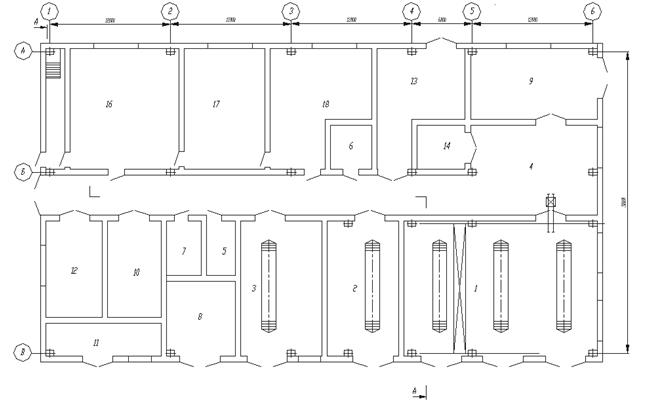 Планировка производственного корпуса должна учитывать технологические связи производственных участков, зон и складов, а также противопожарные и санитарные нормы. Здание производственного корпуса выполняется многопролетным. Ширина пролетов 9, 12, 18 м, реже 24 м. Шаг колонн 6 м или 12 м. Высота здания до нижнего пояса ферм при ширине пролета до 12 м и использовании кран-балок, управляемых с пола 5, 4 м или 6, 8 м, при ширине пролета 18 м будет равна 7, 2 м; при использовании мостовых кранов и пролете 18-24 м будет равна 8, 4 м. Типовые ворота (ширина´ высота) 3, 0´ 3, 0; 3, 6´ 3, 6; 3, 6´ 4, 2. Ширина проездов 3, 5-4 м. Ширина проходов 1, 0-1, 5 м. Санитарными нормами предусмотрено не менее 4, 5 м2 площади и не менее 15 м3 объема на одного работающего в производственных помещениях; в административно-хозяйственных помещениях - 3, 25 м2. Площадь производственного корпуса с учетом зон ТО и ремонта, производственных участков, административных, бытовых помещений и складов запасных частей и инструментов составит: Fпрк = 2102, 5 м2. Определим длину корпуса, число и ширину пролетов и шаг колонн. Принимаем 1 пролет 12 и 1 пролет 18 метров тогда ширина корпуса составит Bпрк=30 м.