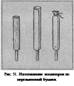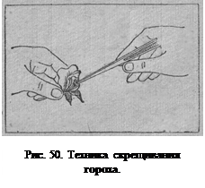 Изоляция. На кастрированные цветки следует надеть пергаментные изоляторы типа хлопушки с таким расчетом, чтобы под ним оказалась часть побега (рис. 52). При надеваниии изоляторов на побеге нужно срезать все нераспустившиеся бутоны и крупные листья, а на стебель намотать ватку. Чтобы изолятор плотнее обжимал побег, нижнюю часть его нужно намочить, плотно прижать к побегу и завязать шпагатом, оставив концы свободными (рис. 52) (в фазу бутонизации). Сбор пыльцы. Пыльцу для опыления собирать с цветков отцовского сорта Уладовский в день опыления и кисточкой или пинцетом перенести ее на рыльце материнского растения. Нужно стремиться, чтобы от сбора пыльцы до опыления прошло как можно меньше времени, иначе пыльца потеряет жизнеспособность. Опыление. Опылять нужно тогда, когда крылья и парус цветков материнского сорта примут характерное для цветка положение. В это время рыльце уже созрело и способно воспринимать пыльцу. Опылять цветки гороха лучше всего в утренние часы, когда на рыльце выступает капелька жидкости. Опыление можно производить без предварительного сбора пыльцы, а прямо проводя цветком отцовского сорта по рыльцу кастрированного цветка материнского сорта (через 2—3 суток после кастрации). Этикетирование. После опыления на кастрированные цветки материнского сорта нужно вновь надеть изолятор и поместить этикетку, на которой сделать надпись: Культура: горох Сорта: Рамонский 77× Уладовский Дата кастрации... Дата опыления … Количество цветков … Гибридизатор … Повторное опыление. Восприимчивость рыльца к пыльце сохраняется несколько дней, поэтому для лучшего оплодотворения опыление целесообразно повторить. Определение результатов опыления. Результаты опыления проверить через 5—6 суток. Для этого снять изолятор и установить, завязались ли бобы. Данные проверки занести в журнал гибридизации по следующей схеме:
