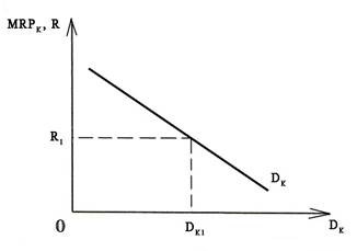 На рынке фактор производства " капитал" поступает в двух взаимосвязанных формах: физической и денежной. Рыночный спрос на капитал формируют предприниматели. Спрос на услуги капитала можно представить на графике в виде отрицательной кривой. На вертикальной оси откладывается цена на услуги капитала (или рентная оценка) R, а также предельный продукт капитала в денежном выражении, а на горизонтальной оси - количество услуг капитала (DK).