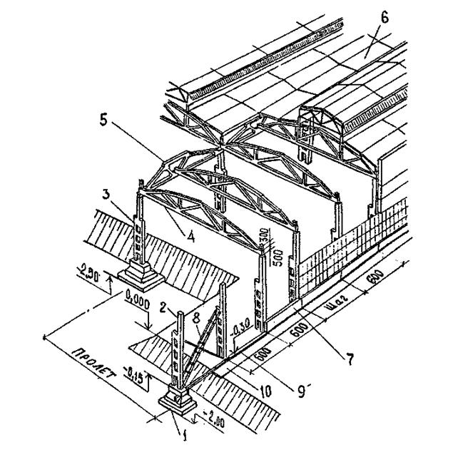 Рис.2. Одноэтажное многопролетное каркасное здание из сборного железобетона 1 – фундаменты колонн; 2 – пристенная колонна; 3 – средняя колонна; 4 – ферма покрытия; 5 – подстропильная ферма; 6 – плиты покрытия; 7 – стеновая панель; 8 – вертикальные связи; 9 – фундаментная балка; 10 - отмостка
