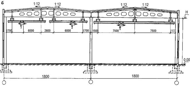 Рис.8. Одноэтажное здание: а – без кранового оборудования с наружным водостоком; б – с подвесными кранами с внутренним водостоком