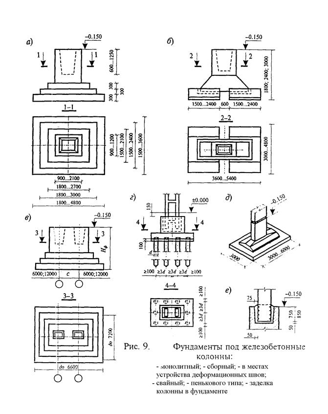Рис. 10. Сборные железобетонные колонны производственных зданий: I – для одноэтажных зданий; а, б – сплошные – для зданий без мостовых кранов; в, г – для зданий с мостовыми кранами; д, е – двухветвевые с мостовыми кранами; II – для многоэтажных зданий: а, б – с одноэтажной разрезкой; в, г – с двухэтажной разрезкой