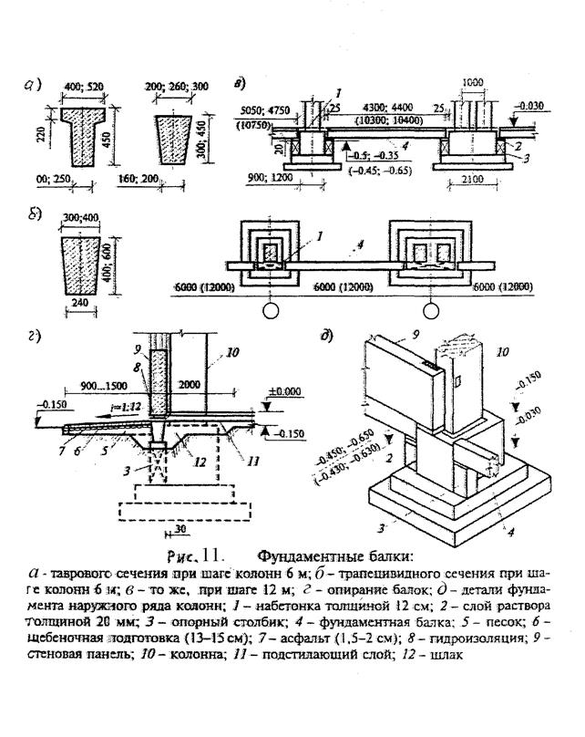 Рис. 14. Железобетонные подстропильные фермы и балки покрытия а – подстропильная ферма пролетом 12 м для скатных кровель; б – то же для малоуклонных кровель; в – подстропильная балка; г - подстропильная ферма в установленном положении