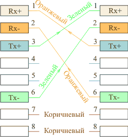 а) б) Рис. 4. Цоколевка разъемов Ethernet-кабеля: нормального (а) и перекрещивающегося (б)