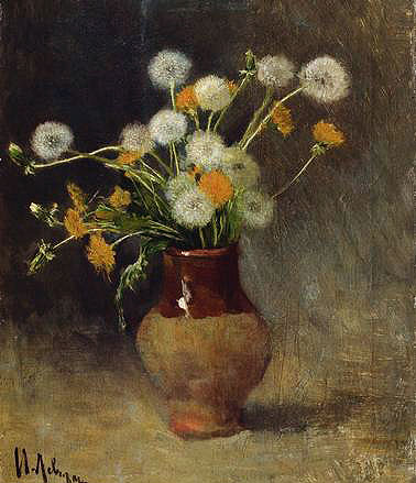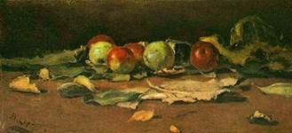 Представления о гармонии непосредственно исходят от природы, и растительный мир играет здесь далеко не последнюю роль. Цветы издревле являются содержанием многих натюрмортов, деревья и кустарники вошли неотъемлемой частью в картины крупнейших мастеров живописи, растительный орнамент характерен для всего прикладного искусства. А сколько плодотворных идей черпают в мире растений архитектура и современный дизайн! Начинающие художники часто рисуют и пишут растения. Однако в первые дни работы неудач куда больше, чем достижений. Вместо привлекательных и художественно полноценных образов на листах бумаги и картона получаются сумбурные путаные формы, в цвете, рисунке которых почти нет ничего от богатства окружающей природы. Изображать растения вовсе не просто. Тут требуется максимум внимания, настойчивости, методичности, а главное – знаний того, что делаешь. Всякий поверхностный, недобросовестный подход, игнорирование ненужных на первый взгляд деталей приводит к неудаче. Форма растений различна по конструктивной сущности, пластике, художественному очарованию. Кроме того, приходится встречаться со всевозможными ракурсами, сложнейшей ритмикой и переплетением форм, с неожиданными цветовыми нюансами. В. Серов. «Яблоки на листьях». Масло. 1879. Почти все отличают ромашку от одуванчика, но на поверку оказывается, что мало кто может верно описать вид их листьев. Присев отдохнуть в высокой траве, многие не могут узнать самых общеизвестных растений, так как угол зрения становится необычным для глаза. Поэтому первое правило – вдумчиво рассматривай то, что хочешь изобразить. Процесс этот неспешный. Он включает в себя анализ формы и осознание красоты ее построения. Нужно научиться любоваться самой незаметной придорожной травкой и понять, что она так же красива, как и заморская орхидея. Мало того, она – художественно совершенна, и все зависит от того, чтобы увидеть это и суметь воплотить в живописи или рисунке. Рассматривать растение необходимо с разных сторон, иначе листья и плоды помешают увидеть конструкцию, взаимосвязь элементов и наиболее интересные фактурные особенности. Если это дерево – лучше обойти его вокруг. Небольшой цветок хорошо будет виден на фоне белой рисовальной бумаги (и не обязательно для этого срывать цветок, ведь можно возле него положить лист бумаги). В итоге выбирается удобное место, позволяющее с полнотою раскрыть характер растения. Изображают не только одно растение, иногда возникает потребность в их группировании. Это усложняет композиционный поиск, но положительный результат искупает трудности. Группирование не должно переходить в форму объемистых «богатых» букетов, где цветы, стиснутые в стеклянной банке или вазе, находятся в неестественном состоянии. Посмотрите, как классически просто компонуют расположение букета в своих произведениях такие разные по времени художники, как Е. Романова, А. Васильев, И. Левитан. Следующий этап – выбор материала и приема его использования. Зарисовки на природе делаются карандашами разных сортов и цветов, соусом, сангиной, углем, пером, тушью. Но не только. Широкими техническими возможностями обладает кисть. Умение рисовать кистью – один из важнейших навыков художника. Она чутко реагирует на малейшее изменение давления руки, и след от нее, чем бы ты ни пользовался: а