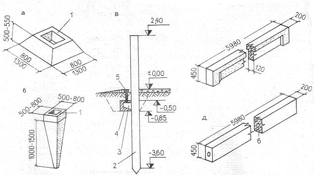 Рис 10.2. Сборочные ж/б конструкции подземной части с/х зданий а – фундаментные башмаки; б – короткие пирамидальные сваи; в – сваи-колонны; г – фундаментные балки; д – цокольные панели; 1 – «стакан» фундамента; 2 – свая; 3 – опорный стальной столик; 4 – обетонирование; 5 – фундаментная балка;