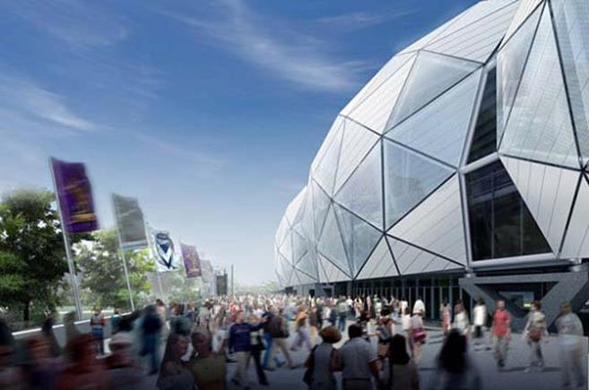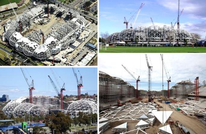 Прямоугольный стадион в Мельбурне (так уж сложилось, что современные стадионы стали воплощением новейших достижений в области проектно-строительных технологий). Этот спортивный объект для игры в футбол и регби стоимостью 250 миллионов долларов и вместимостью 31000 зрителей, расположившийся в Олимпийском парке столицы Австралии, был открыт в 2010 году. Его проектирование и возведение полностью осуществлялось с применением программы MicroStation и других BIM-приложений компании Bentley. Такой подход позволил, используя математически точную информационную модель всего стадиона, разработать и изготовить прикрывающие трибуны конструкции на основе специальных бионических форм, что, наряду с применением новых композиционных материалов, привело к 50% экономии стали по сравнению с обычными проектами подобных по масштабу сооружений Мельбурнский прямоугольный стадион отлично сочетает инженерное искусство с эко принципами. Фасад стадиона имеет форму пузыря. Стадион имеет уникальные консольные конструкции, которые в сочетании с треугольными панелями фасадов позволяют использовать на 50% меньше стали, чем типичные консольные конструкции крыши. Поверхность представляет собой сочетание стекла, металла и жалюзи, для освещения стадиона используются светодиоды. Купола оснащены системой сбора дождевой воды, и устроены таким образом, чтобы по максимуму обеспечивать естественное освещение и естественную вентиляцию, что позволяет снизить зависимость структуры от электросети. Реализацией проекта занималось архитектурное бюро Cox Architects, вдохновением же послужил американский архитектор Бакминстер Фуллер и его идея геодезического купола.