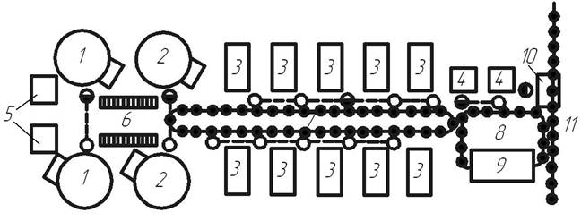 Рисунок 4 1 и 2 – токарная обработка; 3 – фрезерования зубьев; 4 – зубодоводочные станки; 5 – заготовки; 6 – рольганг; 7 – конвейер 1; 8 – конвейер 2; 9 – моечная машина; 10 – ОТК; 11 – конвейер в термический цех.