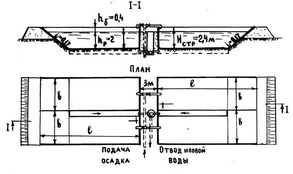 Рис. 9. Схема иловых площадок на естественном основании Расчет иловых площадок на естественном основании рекомендуется производить в следующей последовательности. Первоначально устанавливают суточный объем сброженного осадка, поступающего на иловые площадки W сбр, м3/сут. При двухъярусных отстойниках W сбр подсчитывается по формулам (43) или (44), а при осветлителях-перегнивателях W сбр = W сут – по формулам (56) или (57). Полезную площадь иловых площадок F п, м2, определяют по формуле