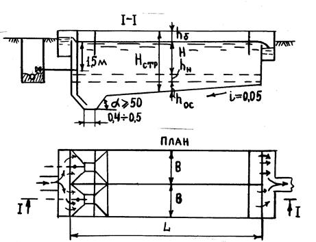 где Q ч – максимальный часовой расход сточных вод, поступающих на очистную станцию, м3/ч; t – продолжительность контакта сточных вод с хлором, ч; t = 0, 5 ч. Далее принимают глубину проточной части отстойников Н, м, (Н = 1, 5–4 м), ширину их В, м, [ В = (2–5) Н ], назначают число отстойников n (табл. 17) и определяют длину отстойника L, м, по формуле