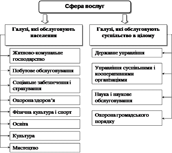 Кожний сектор містить у собі укрупнені (комплексні) галузі. Кожна з цих галузей складається з простих галузей. Прості галузі можуть ділитись на підгалузі і види виробництв. Наприклад, промисловість поєднує 16 укрупнених галузей (електроенергетика, паливна, чорна металургія, кольорова металургія, легка, харчова промисловість, машинобудування та металообробка тощо). Укрупнена галузь машинобудування та металообробка включає близько 60 простих галузей. Структура невиробничої сфери зображена на рис. 3.4.