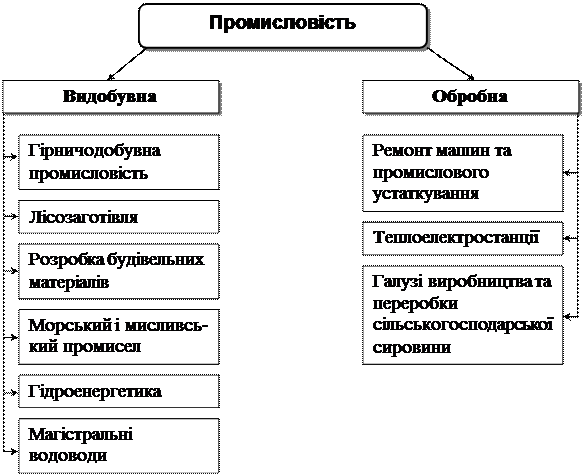 Таким чином, основні властивості, що характеризують галузі сформованої спеціалізації, – це наявність вивозу продукції даної галузі за межі регіону та високий ступінь концентрації виробництва в даному регіоні. Існує багато підходів до класифікації галузей економіки. За ознакою ефективності розміщення галузі спеціалізації поділяються на: 1) галузі сформованої (фактичної) спеціалізації, в яку включені всі галузі спеціалізації, розміщені в цей момент у регіоні; 2) галузі ефективної спеціалізації, у яку включені ті галузі, розміщення яких у регіоні доцільно за народногосподарськими критеріями; 3) галузі перспективної спеціалізації – ті галузі, ефективної спеціалізації, які поки не розміщені в регіоні; 4) безперспективні галузі спеціалізації – ті галузі, розміщення яких у регіоні не виправдане з народногосподарських позицій. Галузі промисловості поділяються на видобувну та обробну (рис. 3.5).