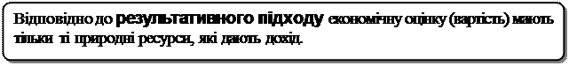 Вартість ресурсів при результативному підході визначається грошовим вираженням первинної продукції, яку одержують від експлуатації природних ресурсів (це різниця між одержаним доходом і поточними витратами). Недоліками такого підходу з погляду раціонального природокористування є: § неможливість визначення для кожного виду природних ресурсів вартості первинної продукції; § неадекватна оцінка доходу від використання ресурсів. Дохід може бути як прямим, так і непрямим (наприклад, використання природних об’єктів із рекреаційною метою, кліматичних ресурсів території).