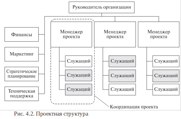 Проектная структура ориентирована на предприятия, у которых профилирующий вид деятельности представлен проектной деятельностью, т.е. направленной на создание нового, нетипового продукта или услуги. Проектная структура (особенно при реализации крупных проектов) представляет собой фактически филиал фирмы внутри предприятия со своими функциональными подразделениями либо является отдельным предприятием, созданным специально под проект. Члены проектной команды полностью ориентированы на результаты проекта и его руководителя. Обе эти структуры имеют свои преимущества и недостатки, поэтому на практике каждая из них в чистом виде используется нечасто. Это вызвано и объективными причинами, поскольку нет предприятий, в которых присутствует в рафинированном виде производственная или проектная деятельность. Обычно используется некоторая их комбинация: например, на функциональную структуру накладывается проектно-ориентированная, в результате чего появляется организационная матрица или матричная структура.