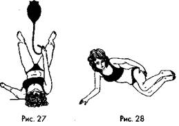 Если почувствуете боль, резь (это может возникнуть из-за метеоризмов или спастических участков кишечника), зажмите пальцами резиновую трубку, остановите ненадолго поступление воды в кишечник. Глубоко подышите, поработайте животом (вверх-вниз). Боль уйдет, придет облегчение. Тогда разожмите пальцы и выпустите остальную воду. Так делайте несколько раз, пока вся вода не войдет в кишечник (рис. 27). Если кишечник сильно завален сухими каловыми массами, нужно больше стараний для их размывания. Кишечник не может держать воду, и она непроизвольно выливается. Тогда влейте столько воды, сколько позволяет самочувствие, пережмите трубочку пальцами, выведите ее из кишечника, закрепите в крючке с клизмой и освободите кишечник над унитазом. Повторите еще и еще раз процедуру, пока вся вода — 2л — не будет использована. Зажимайте трубку обыкновенной прищепкой или зажимом, чтобы вода не выливалась, если будете вливать ее в кишечник по частям. Промывную воду в кишечнике можно подержать 1-2 минуты. Этого времени вполне достаточно, чтобы «сполоснуть» кишечник. Лежа на правом боку, обопритесь на согнутую в локте руку, приподнимите согнутые в коленях ноги. Живот провиснет, и вода лучше пройдет в восходящий отдел ТОК (рис. 28).