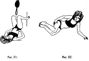 Теперь встаньте, вдохните носом глубоко (вдох-выдох), задержите дыхание и поработайте животом (вверх-вниз) (рис. 29 и 30). Снова встаньте в позу «березка». Вдох-выдох! Работайте животом (рис. 31). Перевернитесь на левый бок и повторите все, что делали на правом боку (рис. 32). После «прополаскивания» кишечника на правом и левом боку освободите кишечник, не сидя ягодицами на унитазе, а стоя на корточках (рис. 33). На корточках лучше всего вытолкнуть залежавшийся кал промывной водой, «сорвать» его со стенки кишечника. Если вы чувствуете, что в кишечнике явно что-то задержалось, а с этим «что-то» надо обязательно расстаться, встаньте в позу упор-присев на полусогнутых коленях, опираясь руками на колени (ноги на ширине плеч), сделайте вдох-выдох, задержите дыхание (кишечник расширится). Поработайте животом (вверх-вниз). И вы почувствуете, «что-то» выходит (рис. 34).