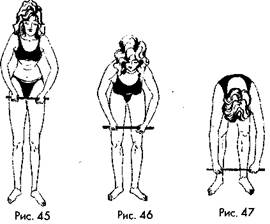 6. «Насос». Возьмите в руки свернутую газету или палочку. Как рукоятку насоса, и думайте, что накачиваете шину автомобиля. Вдох — в крайней точке наклона. Кончился наклон — кончился вдох. Голову не поднимайте, смотрите вниз на воображаемый насос. Повторять вдохи одновременно с наклоном часто, ритмично, легко. Всего 300-500 вдохов (рис. 45, 46, 47).