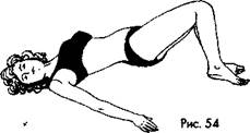 Вход в асану: На счет 3-4 выдох. Голову поверните направо (ложитесь на ухо), ноги — влево, прижав колени к полу (рис. 54).