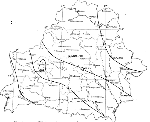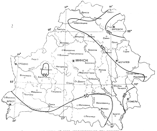 Рисунок А.3 - Схематическая карта объемов снегопереносов, м³ /м, 10%-ной обеспеченности, СНБ 2.04.02–2000