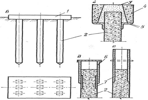 Под стальные колонны каркаса зданий НЦ и КЦ сооружают свайные ф-ты из типовых забивных ж/б свай. Под каждую колонну забивают куст из трех-пяти свай. Оголовки свай, входящих в куст, соединяют ж/б сборным или стальным ростверком (рис. 25). При строительстве применяют сборные ростверки из стального проката. Базы стальных колонн каркаса зданий опирают непосредствено на ростверки. Такие ф-ты под колонны зданий освоены в производстве, сборные детали их в большом количестве выпускают заводы ж/б изделий. Однако массовое применение свайных ж/б ф-тов в районах севера Зап. Сибири осложнено трудностью доставки ж/б сборных ростверков и свай. Использование монолитных ж/б ростверков в суровых условиях Севера чрезвычайно затруднено необходимостью ведения бетонных работ. В связи с этим разработаны новые конструкции свайных ф-тов зданий НС и КС, в которых забивные ж/б сваи заводского изготовления заменены буронабивными сваями, а ж/б ростверки - ростверками из стального проката (двутавров, швеллеров). На голову каждой из свай монтируют стальные оголовки, на которые устанавливают стальные ростверки. Применение подобных свайных ф-тов по сравнению с применением традиционных из забивных ж/б свай позволяет снизить транспортные расходы, исключить проведение бетонных работ непосредственно на строительной площадке и уменьшить трудоемкость возведения ф-тов.