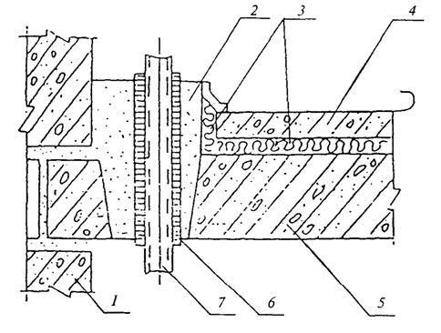 Рисунок 2.3 - Схема конструктивного решения узла пропуска стояка отопления через междуэтажное перекрытие: 1 - стена; 2 - безусадочный бетон или раствор; 3 - прокладка (слой) из звукоизоляционного материала; 4 - бетонное основание пола; 5 - несущая часть перекрытия; 6 - эластичная гильза; 7 - труба стояка отопления