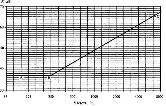 1. Находим частоту, соответствующую точке B, по таблице 2.7: fB = 31000/h = 31000/0, 124 = 250, Гц. Полученное значение частоты совпадает со среднегеометрической частотой третьоктавной полосы. 2. Определяем ординату точки B по формуле RB = 20 где mэ = m∙ K = 256∙ 1, 1 = 281, 6, кг/м2. 3. Из точки B влево проводим горизонтальный отрезок BA, а вправо отрезок BC с наклоном 6 дБ на октаву до точки C с ординатой 65 дБ. Точка C находится за пределами нормируемого диапазона частот. Рассчитанная частотная характеристика приведена на рисунке 2.6.