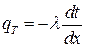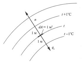 где qT - поверхностная плотность теплового потока, проходящего через плоскость, перпендикулярную тепловому потоку, Вт/м2; λ - теплопроводность материала, Вт/м. оС; t - температура, изменяющаяся вдоль оси x, оС; Отношение Теплопроводность λ является одной из основных тепловых характеристик материала. Как следует из уравнения (2.1) теплопроводность материала - это мера проводимости теплоты материалом, численно равная тепловому потоку, проходящему сквозь 1 м2 площади, перпендикулярной направлению потока, при градиенте температуры вдоль потока, равном 1 оС/м (рис.1). Чем больше значение λ, тем интенсивнее в таком материале процесс теплопроводности, больше тепловой поток. Поэтому теплоизоляционными материалами принято считать материалы с теплопроводностью менее 0, 3 Вт/м. оС.