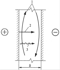 Тепловой поток, проходящий через воздушную прослойку qв. п, Вт/м2, складывается из потоков, передаваемых теплопроводностью (2) qт, Вт/м2, конвекцией (1) qк, Вт/м2, и излучением (3) qл, Вт/м2. qв. п=qт+qк+qл . (2.12)